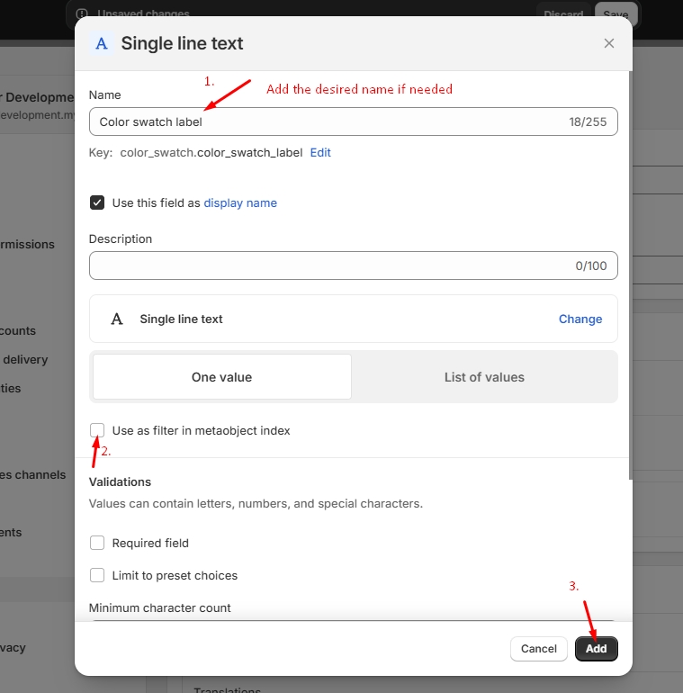 Add the desired name if needed and click on "Use as filter in metaobject index", then click on Add button.