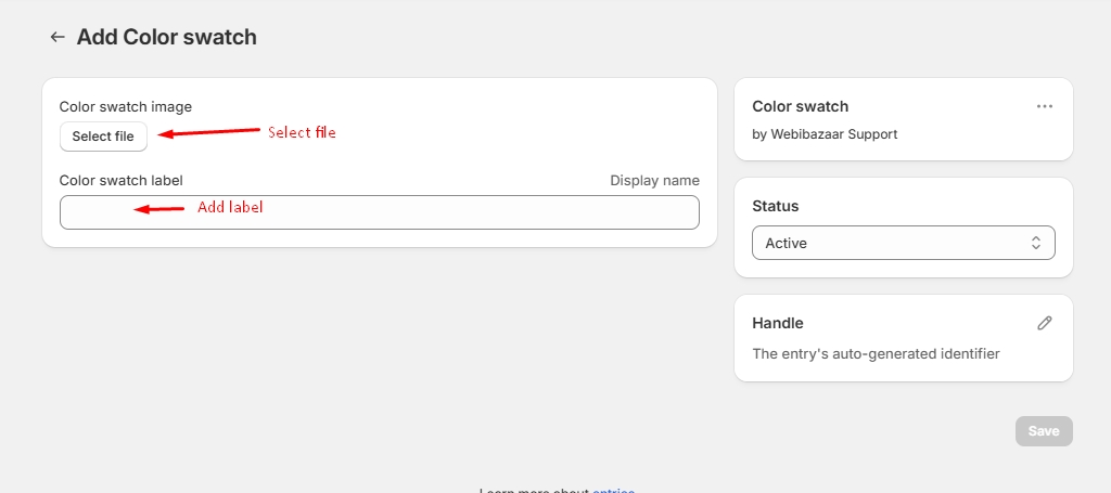 Select the image you want to display in the color swatch filter and add a label, Then Save.