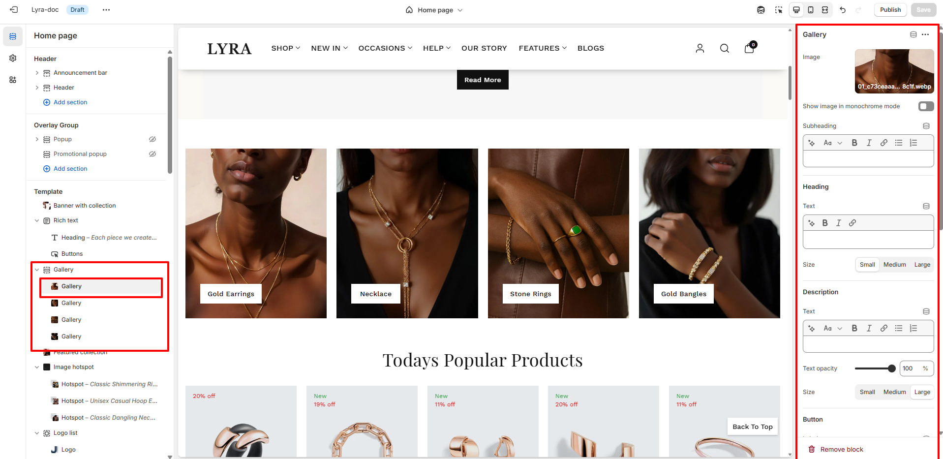 <table data-full-width="false"><thead><tr><th width="282">Block</th><th>Description</th></tr></thead><tbody><tr><td>Image</td><td>Use "Image" to add the image to the section.</td></tr><tr><td>Show image in monochrome mode</td><td>Enable this checkbox to automatically appply image monochrome mode the images in the gallery.</td></tr><tr><td>Remove image</td><td>Enabling this feature will remove the gallery image.</td></tr><tr><td>Subheading</td><td>Enter the text you would like to display as a subheading above the banner's title.</td></tr><tr><td>Heading</td><td><p><strong>Text</strong><br>Enter text to display as a title in the section.<br><br>Customization of the "heading size" in the gallery section is as follows:</p><ul><li>Small</li><li>Medium</li><li>Large</li></ul></td></tr><tr><td>Description</td><td><p><strong>Text</strong><br>Enter text to display as a description in the section.<br><br><strong>Text opacity</strong><br>Use the text to set the opacity of the gallery. You can set a minimum of “10%” and a maximum of “100%”.</p><p></p><p><strong>Size</strong></p><p>Customization of the "Size" in the slide is as follows:</p><ul><li>Small</li><li>Medium</li><li>Large</li></ul></td></tr><tr><td>Button</td><td><p><strong>Label</strong><br>Use "Button label" to add a label to the Button in the section.<br><br><strong>Link</strong><br>Use "Button link" to add a link to the Button in the section.<br><br><strong>Style</strong></p><p>Customization of the "Button style" in the gallery is as follows:</p><ul><li>Link</li><li>Outline</li><li>Solid</li></ul></td></tr><tr><td>Desktop content position</td><td><p>To change the position of the content on the banner, utilize the "Desktop content position" setting. Customization of the "Desktop content position" in the gallery section is as follows:</p><ul><li>Top left</li><li>Top center</li><li>Top right</li><li>Middle left</li><li>Middle center</li><li>Middle right</li><li>Bottom left</li><li>Bottom center</li><li>Bottom right</li></ul></td></tr><tr><td>Desktop content alignment</td><td><p>Customization of "Desktop content alignment" in desktop devices is as follows:</p><ul><li>Left</li><li>Center</li><li>Right</li></ul></td></tr><tr><td>Show content background</td><td>By enabling this checkbox, you can Show content background.</td></tr><tr><td>Content background opacity</td><td>By enabling this checkbox, you have the ability to change the content background opacity. Modify the "Content background opacity" setting to increase or decrease the opacity level of the overlay on the gallery content.</td></tr><tr><td>Enable blur background</td><td>Enabling this checkbox allows you to display a blurred background.</td></tr><tr><td>Color scheme</td><td><p>In this section, you have the option to modify the background and foreground colors of a banner's content container using the provided color scheme.</p><ul><li>Scheme 1</li><li>Scheme 2</li><li>Scheme 3</li><li>Scheme 4</li><li>Scheme 5</li><li>Scheme 6</li><li>Scheme 7</li></ul></td></tr><tr><td>Animations</td><td><p>Customization of the "Image behavior" in the gallery section is as follows:</p><ul><li>None</li><li>Ambient movement</li></ul><p>By employing the Ambient movement feature, the banner image will exhibit motion.</p></td></tr><tr><td>Mobile layout</td><td><p><strong>Content alignment</strong></p><p>Customization of "Mobile content alignment" in mobile devices is as follows:</p><ul><li>Left</li><li>Center</li><li>Right</li></ul><p></p><p><strong>Content position</strong></p><p>To change the position of the content on the gallery, utilize the "Mobile content position" setting. Customization of the "Mobile content position" in the gallery section is as follows:</p><ul><li>Top</li><li>Middle</li><li>Bottom</li></ul></td></tr></tbody></table>