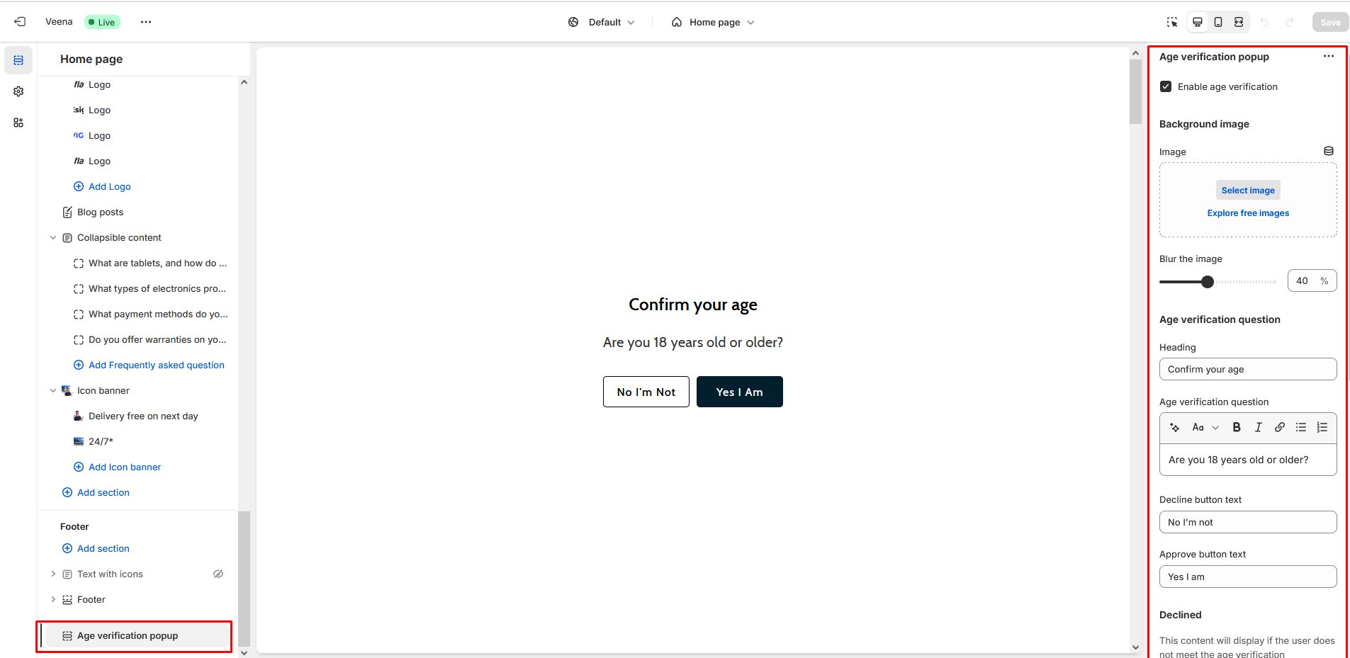 <table><thead><tr><th width="272">Setting</th><th>Description</th></tr></thead><tbody><tr><td>Enable age verification</td><td>Enabling this checkbox will display an age verification popup.</td></tr><tr><td>Background image</td><td><strong>Image</strong><br>Use "Image" to add the image to the section.<br><br><strong>Blur the image</strong><br>By adjusting the range of the blur image, you can control the background image's level of blurriness.</td></tr><tr><td>Age verification question</td><td><p><strong>Heading</strong><br>Enter text to display as a heading on an age verification popup section.<br><br><strong>Age verification question</strong><br>Enter text to display as an age verification question in the age verification popup section.<br><br><strong>Decline button text</strong></p><p>Use "Decline button label" to add a label to the Button in the section.<br><br><strong>Approve button text</strong><br>Use "Approve button label" to add a label to the Button in the section.</p></td></tr><tr><td>Declined</td><td><strong>Heading</strong><br>Enter text to display as a heading on an age verification popup section.<br><br><strong>Text</strong><br>Enter text to display as a description on an age verification popup section.<br><br><strong>Return button text</strong><br>Use "Return button label" to add a label to the Button in the section.</td></tr><tr><td>Color scheme</td><td><p>In this section, you can change the background and foreground color of a section using the color scheme.</p><ul><li>Scheme 1</li><li>Scheme 2</li><li>Scheme 3</li><li>Scheme 4</li><li>Scheme 5</li></ul></td></tr></tbody></table>