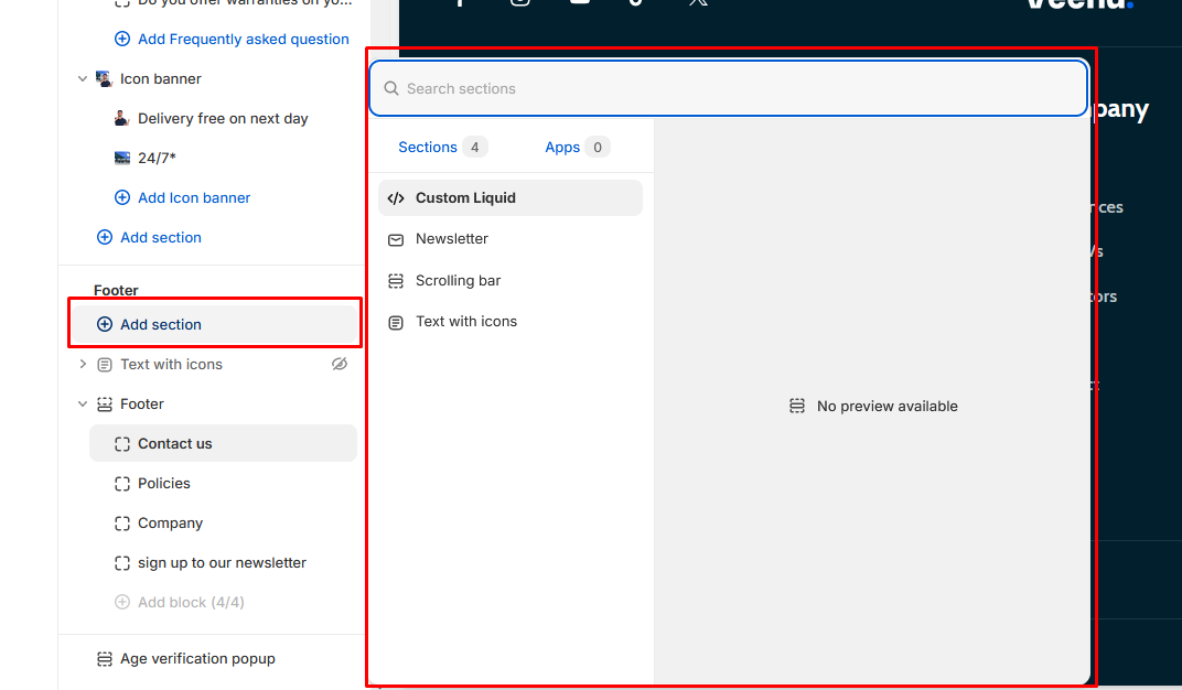 Veena theme provides a section, namely "Footer" in this section. There are many options available , as you can see in the below points and screenshot.