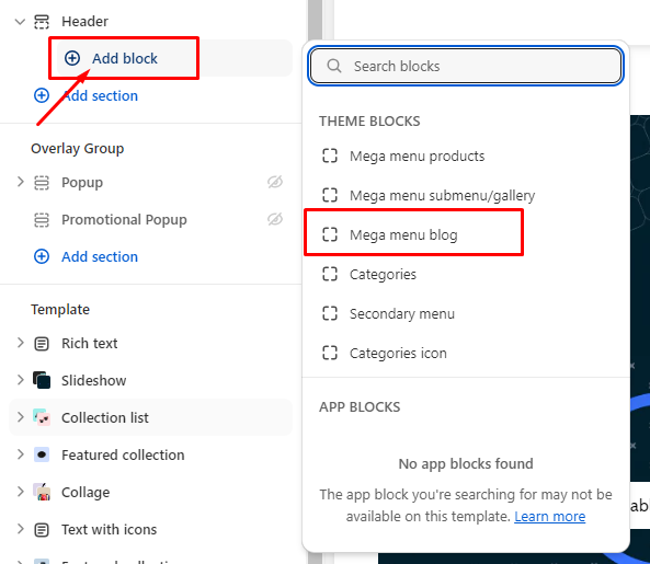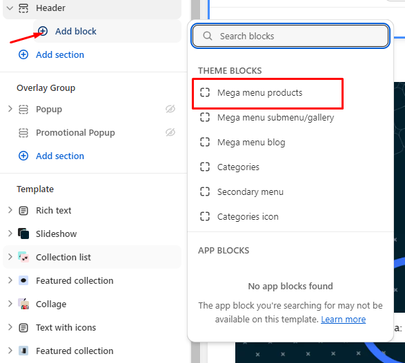 2. Click on "Add block.", user can create three types of blocks: Mega menu products, Mega menu submenu/gallery, Mega menu blog, Categories, Secondary menu, Categories icon.