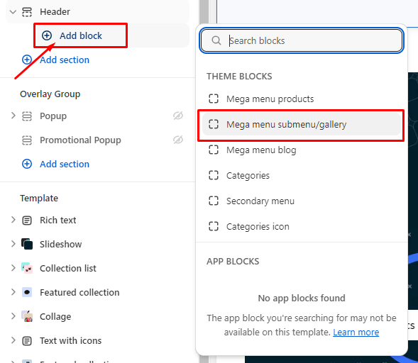 Click on "Add block" and add the **Mega menu submenu/gallery** block.