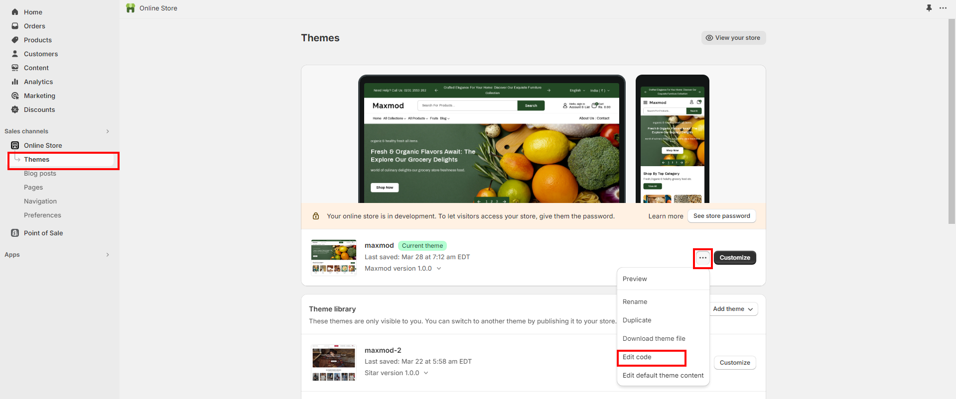 2. Follow to the section Online Store > Themes in your store. Click the three dots button of your theme.