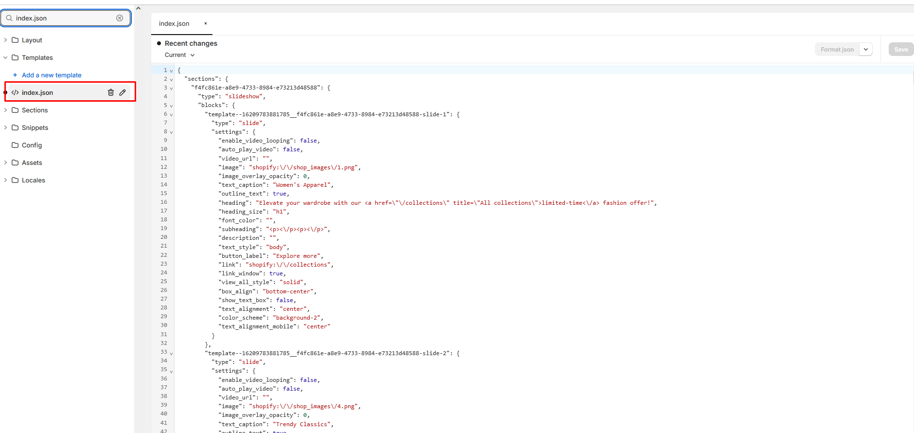 4. In the code editor, search for the file "index.json" and paste the demo structure. Click "Save" to save your changes. If there's an error, click "Format json" and try to save the file again.