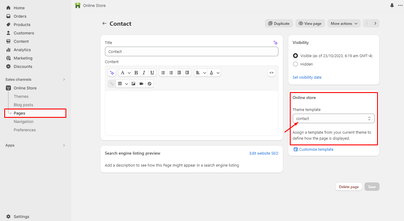 To add the **Contact us** page, select contact in the Theme Template dropdown. When you select **Contact** in the dropdown, you will be able to customize the contact page.