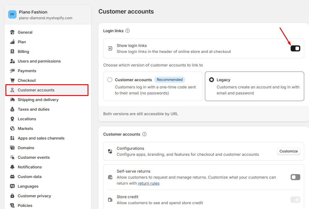 * From your Shopify admin, go to Settings > Customer accounts.