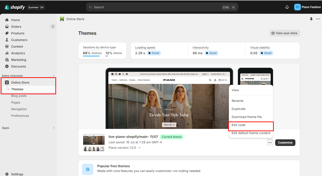 Log in to your store admin. In your Shopify admin dashboard, go to **Themes**, and find the theme that you want to edit. When you see a dropdown section, select **Edit code**