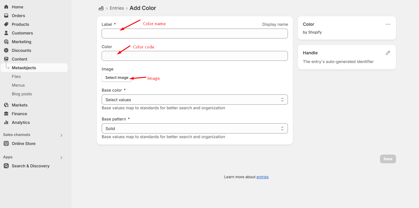* In the Shopify admin panel, go to the **Content > Metaobjects > Active**