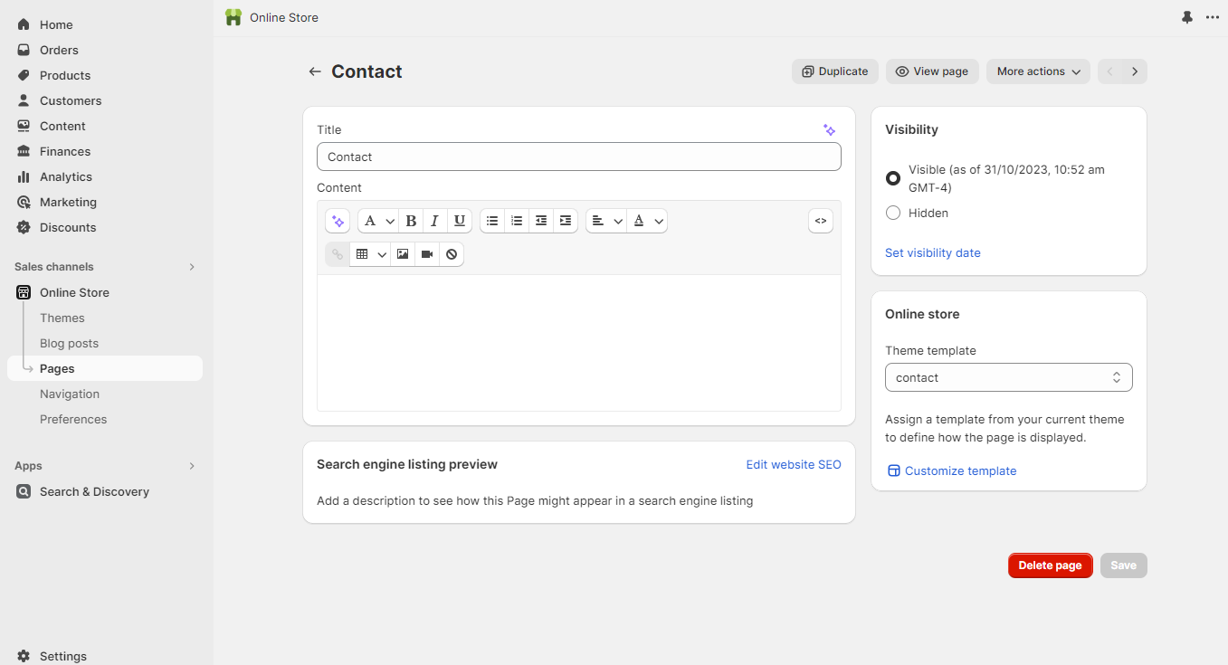 If you have a Shopify online store, then you can create webpages in your Shopify admin. Webpages contain information that rarely changes or that customers will often reference, like an “About Us” page or a “Contact Us” page.