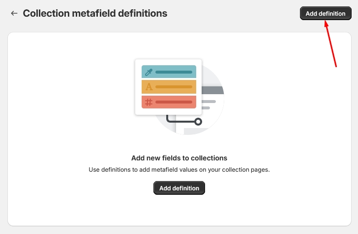 Before you can add Collection image(metafield value) to specific collections, you need to add the necessary metafield definition for this information.