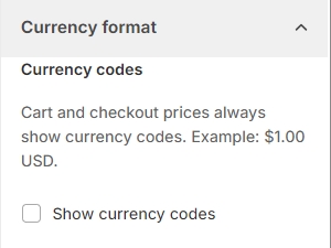Show currency codes Toggle to show or hide currency codes (like USD, EUR) next to the price in the cart and checkout. Example: $1.00 USD.