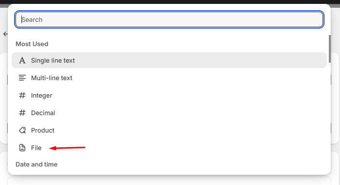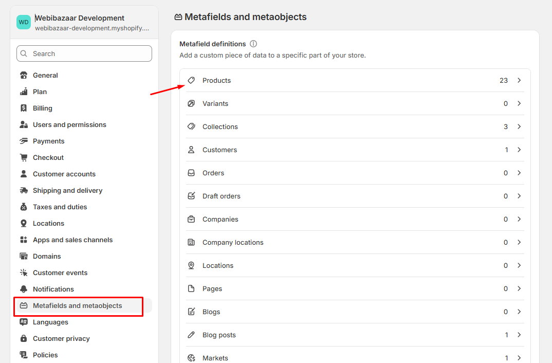 * From your Shopify admin, go to **Settings** > **Custom data > Products.**