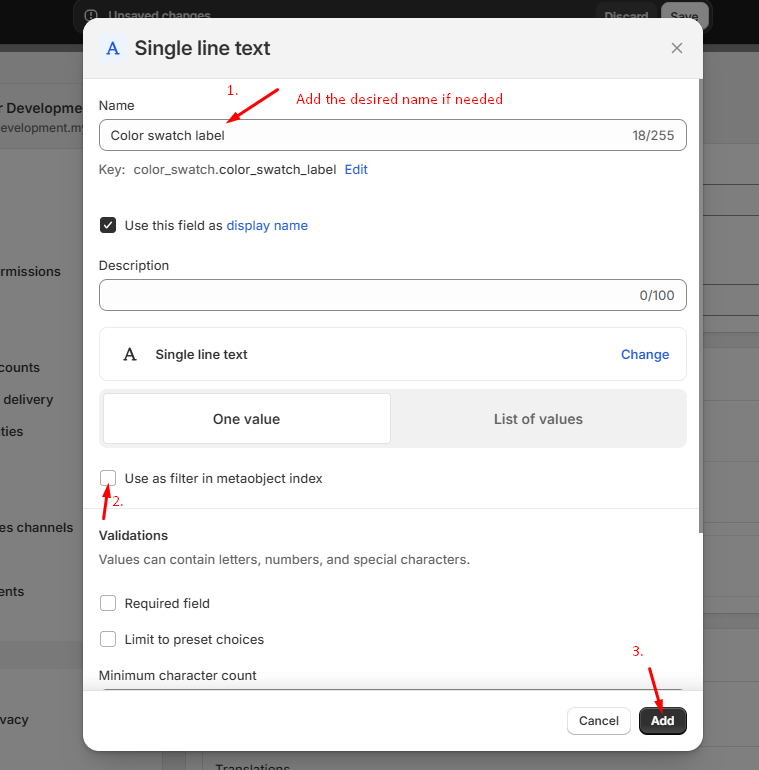 * Add the desired name if needed and click on "Use as filter in metaobject index", then click on **Add** button.