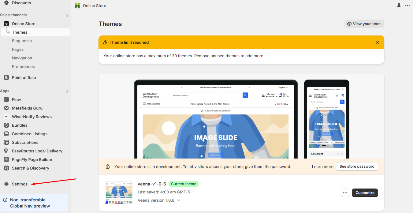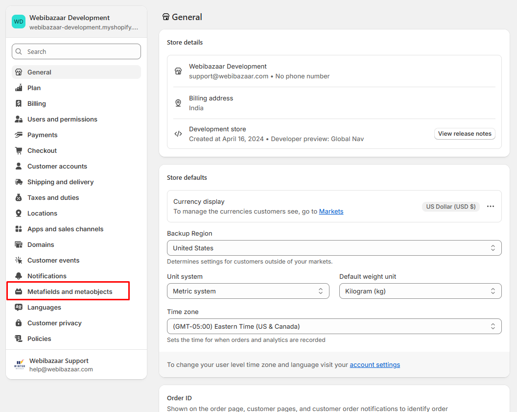 * From your Shopify admin, go to **Settings** > **Custom data.**