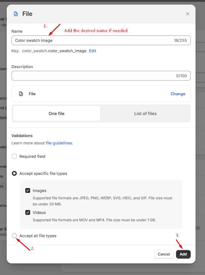 * Add the desired name if needed and Accept all file types, then click on **Add** button.