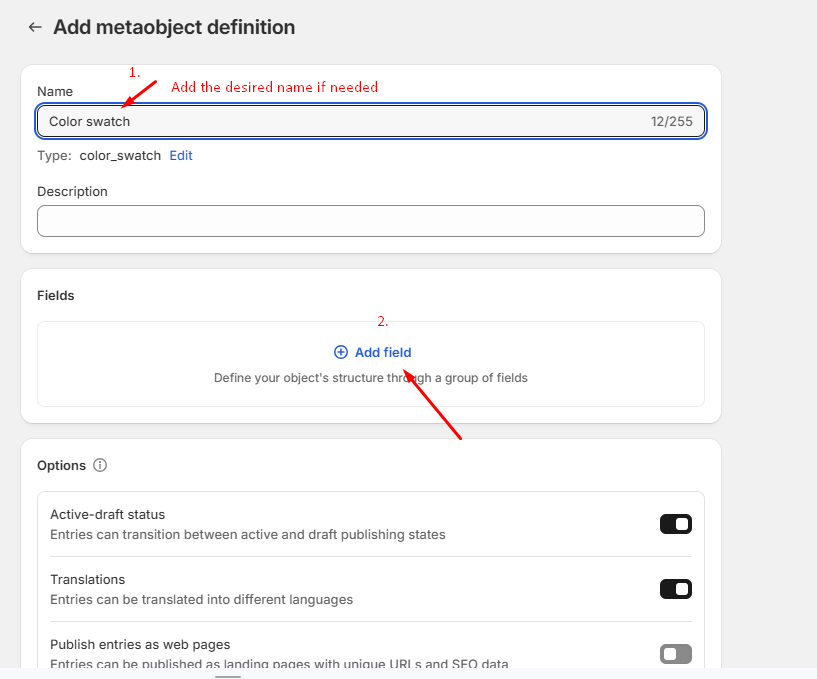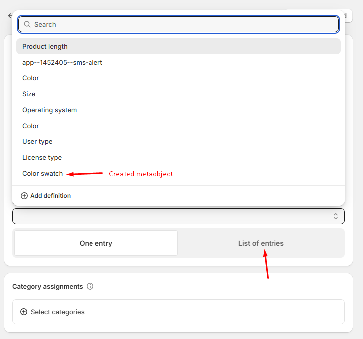 * Click on created metaobject, then select the "List of entries" and **Save**.