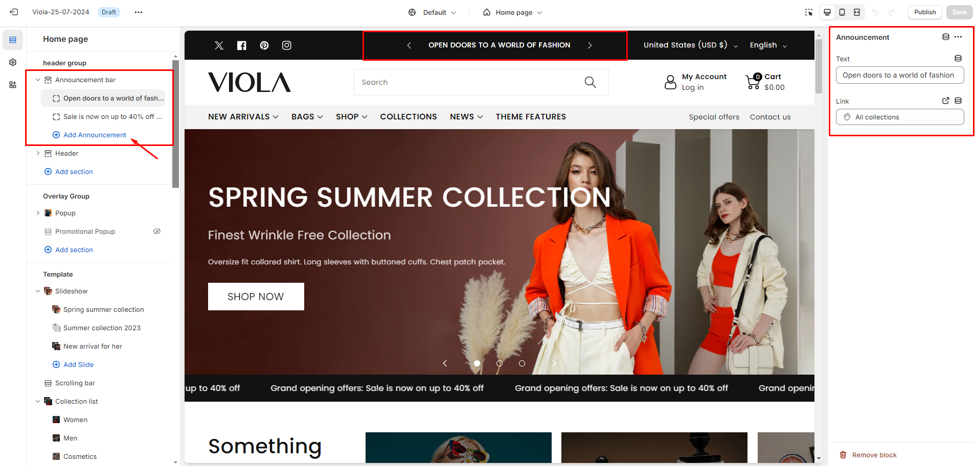* Change the text of the announcement bar section.