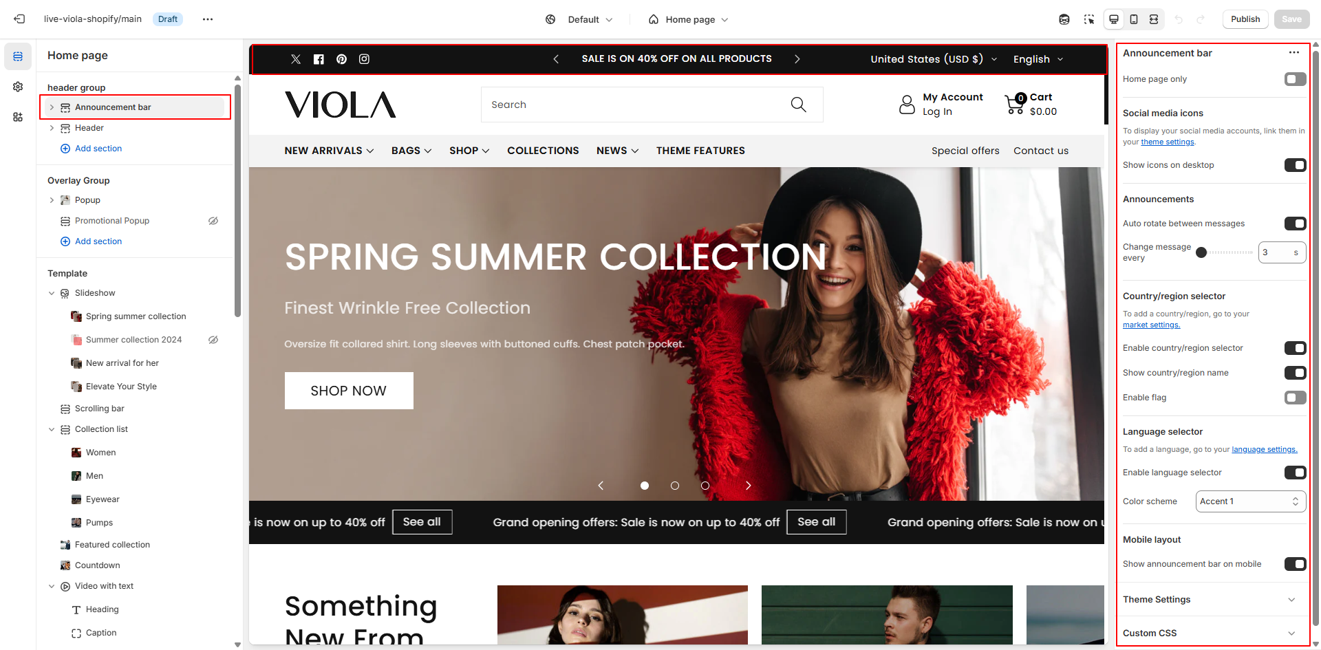 * Change the background and text color of your Announcement bar section.